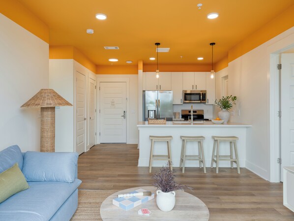 Each Two Bedroom Suite at The Gilmore offers an ideal space for groups or families looking for extra room to spread out. Each suite features a king-size bed and a queen bed with blackout curtains, along with a living area with TV that includes a sleeper sofa for added flexibility. Large windows fill the space with natural light, creating a bright and welcoming atmosphere, perfect for enjoying the fresh air and views. The kitchen is fully equipped with a sink, microwave, stove, and fridge. Perfectly suited for both relaxation and togetherness, these suites provide all the comforts of home with all the advantages of a hotel.