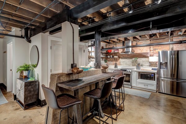 This rental consists of 2 separate but neighboring units located in the building’s basement level. What makes these units special is their unique level of privacy and seclusion that allows guests to enjoy the deepest possible rest. Because of their lower-level location, these units feature exposed stone walls that are the very foundation of the building. The rich stone detail is an aesthetic delight, and also a grounding feature that creates unmatched coziness. Not to mention, staying in the foundation of this building further enriches the experience of staying on a property that is foundational to the history of Nashville. Thoughtfully placed lighting creates a soft and restful mood, while the units are expertly designed to offer an open-concept main living area to maximize quality time amongst guests. In each home, the living room provides ample seating, a smart TV, vibrant textiles, and completely unique art pieces. Steps away, the kitchens come fully equipped with a suite of stainless steel appliances and necessary cookware to whip up a meal from home, which can be enjoyed at the kitchen tables, each with seating for 4.