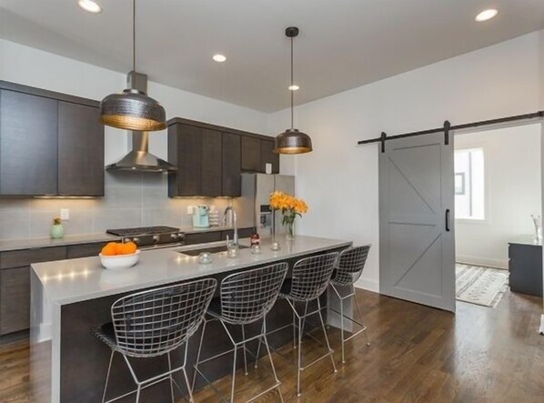 Queste cucine sono completamente attrezzate con elettrodomestici in acciaio inossidabile, fornelli a gas e ampio spazio sul bancone.