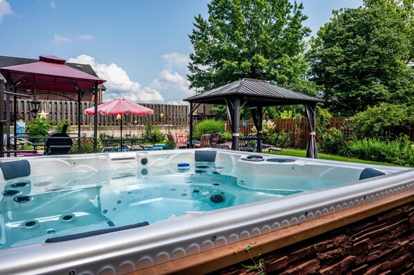 Meander your way back through the house to find those previously mentioned patio doors. Now you can find out what is meant by “blessings” in the name “Backyard Blessings.” Through those patio doors, you will step into your own private oasis! The gorgeous landscaping makes this place feel like a mini botanical garden. Walk barefoot through the super soft grass and enjoy all of the beauty and smells of the flowers growing around you. Among the other offerings here are a large hot tub, plenty of relaxing seating, a grill for the traditional cook out, and enough table and chairs for everyone! But, even with all of this, the feature item here is the full-size inground pool! Enjoy the privacy of your own pool, right here in the backyard! With the huge fence surrounding the entire place, your privacy is guaranteed, despite the in-town location. Like we mentioned before... your own private vacation resort!