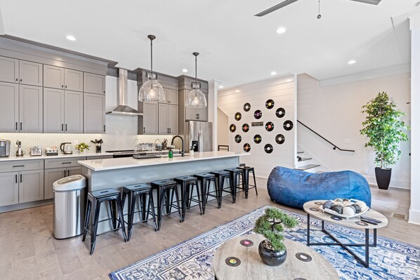 Overall very happy with the property. Would definitely stay there again. Pros: -Clean -Everyone has plenty of room to spread out and have their own space. -Great location -Highly recommend checking out the Pearl Diver across the street for a date night! -Plenty of supplies to get you started (dish soap, toilet paper, trash bags, laundry detergent, etc.) -Publix is very close and convenient Cons: -Listing states all bathrooms are private but the bathroom on the second floor is not en-suite. It is located right outside the bedroom. -The bedroom on the first floor does not have a TV and the bed was in the way of easily closing the door. -No dining room table but plenty of counter seating. -Kitchen cooking utensils are lacking (no measuring cup, large sauté pan, blender)