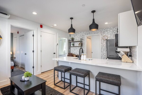 I travel frequently for work and have Marriott Ambassador status. This unit checks all the boxes for a clean, convenient and comfortable stay with greater value than staying at a hotel - especially if visiting the area as a parent assisting a Vandy student. I would stay here again. It is on par with a newly renovated Residence Inn or Courtyard, but with the benefit of being in a true apartment. We stayed at this condo for three nights and used it as a home base to help our daughter (incoming Vandy business school grad student) search for an apartment. My husband and I stayed in the king size bedroom and our daughter stayed in the queen bed. The beds were very comfortable with soft sheets. The unit was perfectly located, very clean on arrival, has updated finishes - it was clearly remodeled recently. Good pressure in shower, well stocked kitchen - new dishes, glasses, knives. Small but functional living area and desk is a nice touch as we had a few work tasks to tend to. Strong WiFi and safe mostly residential area. The unit is close by to a busy street, but the owner has installed blackout curtains to eliminate street lamp from interrupting sleep. There are no closets in the bedroom (the unit is on the small side) but for a short stay it is fine and the owner installed an open “closet” area with hanging bar and hangers. No drawers though, except in nightstand. Again - fine for a shorter stay. I really enjoyed this stay and was hesitant at first. I am glad I booked.