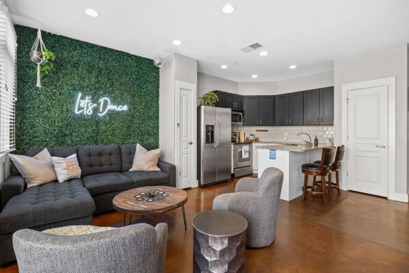 We had a wonderful stay. The unit was spotlessly clean, beautifully decorated, and stocked with kitchen essentials, extra towels and toiletries. The neighborhood felt safe with security codes to get into the building and then our condo. It was located close enough to downtown (about 10 min Uber) to easily enjoy all the restaurants, live music, and attractions, but tucked away enough to feel peaceful and relaxing at the end of the night. The check-in process was seamless, and Mark was incredibly responsive and welcoming.The greenery with the neon sign was perfect for pictures and gave the place a fun atmosphere. The beds were super comfortable, and all the amenities (Wi-Fi, smart TVs, washer/dryer) were great.We would absolutely stay here again and highly recommend it to anyone visiting Nashville. Five stars all the way!