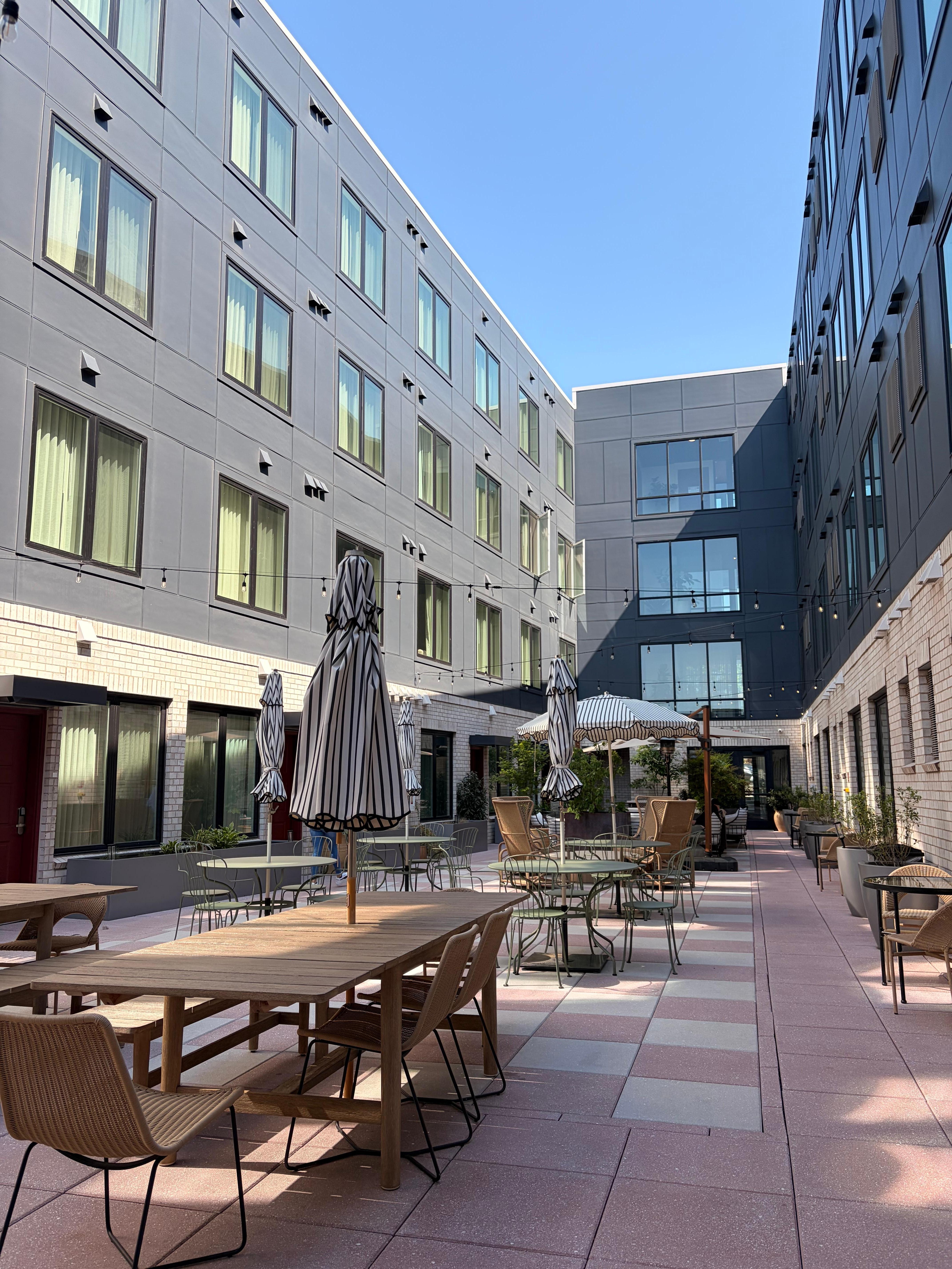 The hotel is really nice but no real added amenities except a couple patios. No big deal though because it’s surrounded by restaurants/bars/shops and a park all within walking distance. REALLY nice area. Great for dogs and exercise conscious people. Would absolutely stay again. Staff is always nice!