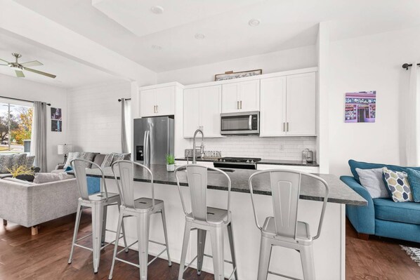 • Open-concept living/dining with seating for 8