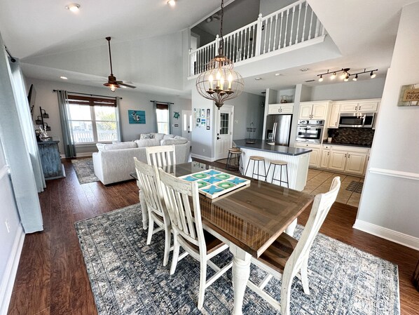 Spacious Open Floor Plan: The main level features a large kitchen, living, and dining area bathed in natural light from expansive windows and enhanced by high ceilings.