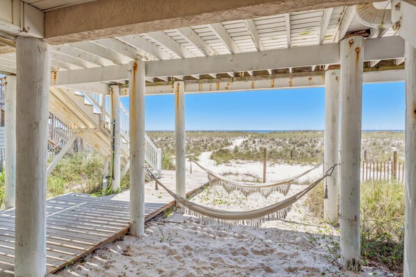 For those rainy days or afternoons when you just want to be out of the sun the covered carport has two tables with seating and a wall mounted television. This is a great area to grill out using either the gas grill or BBQ grill provided, and the outside shower helps wash away the beach when you are done playing in the sand.