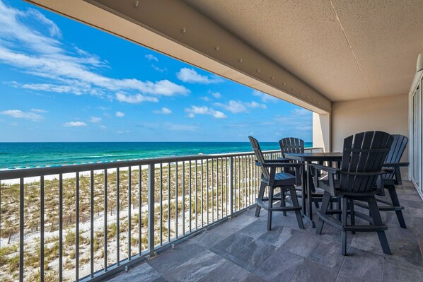 • Spacious outdoor balcony with comfortable seating overlooking the Gulf
