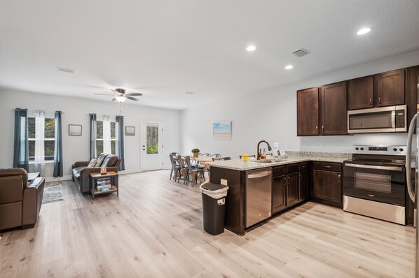 The open-concept living/dining room will undoubtedly be the hub of this beautiful retreat just steps from the sand! Cozy furnishings and plenty of seating encourage time together, whether preparing delicious meals in the beautifully appointed kitchen or playing board games at the dining room table. Cleanups are a breeze with a full-sized washer and dryer, leaving more time for fun adventures, like hitting the community pool and heading to the beach for hours of fun!