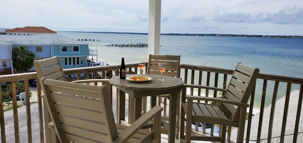 Beautiful, newly renovated waterfront townhouse with the Santa Rosa Sound right out your door and short 5-minute walk to Gulf of Mexico. Non-Peak season weekly and monthly discounts start early August. Spread out in this 2000 sq ft, 3BR/2.5 Ba, w/ 3-stories, 4 decks and panoramic views of Navarre Beach, Santa Rosa Sound and Gulf of Mexico. Enjoy your morning coffee from private master bedroom balcony overlooking beautiful Santa Rosa Sound and and experience spectacular happy-hour sunsets from 3rd story widow's watch. The sound of waves will lull you to sleep --K/K/T/T/T/T layout comfortably sleeps 8. Spend your days fishing, swimming, kayaking or paddleboarding in the calm Santa Rosa Sound--steps out your door, sunbathing on the snow white sands of beautiful Navarre Beach, and playing in the waves of the Gulf of Mexico, a short (5 minute) walk across the street. Being on the Sound side is especially nice on days the Gulf is rough and currents are strong. Unit was recently remodeled throughout, with all new kitchen and appliances, furniture, flooring, paint, and 2.5 beautifully remodeled bath rooms. Extra large fridge/freezer and separate beverage/wine fridge means you can grocery shop once and enjoy your week at the beach. 3 bedrooms upstairs with gorgeous master bath with walk in shower w/ dual shower heads, dual vanities. 2nd upstairs full bath with shower/tub combo. Two bedrooms have king beds and 3rd bedroom has 2 sets of bunk beds with extra long twin mattresses for kids or adults. On the main floor is the kitchen, breakfast nook, separate dining room, half bath, and huge family room with spectacular views of Santa Rosa Sound and the intercoastal waterway. Decks off kitchen and master bedroom with water views, and 2 additional decks on top floor, one covered and one uncovered sun deck, with panoramic views of the island and Gulf. Full-size washer and dryer. Ground floor has 2+ car garage with lots of room for big or small beach toys. There is an outside shower with hot and cold water, perfect for a quick rinse off after your day at the beach. Townhouse is located on residential street with ample parking in garage or driveway. Unit is #4 of a five unit waterfront townhouse complex, which is built staggered across the property so that each unit has water frontage and gorgeous views. Bars, restaurants, convenience store, and the Navarre Beach fishing pier all within a short walk.