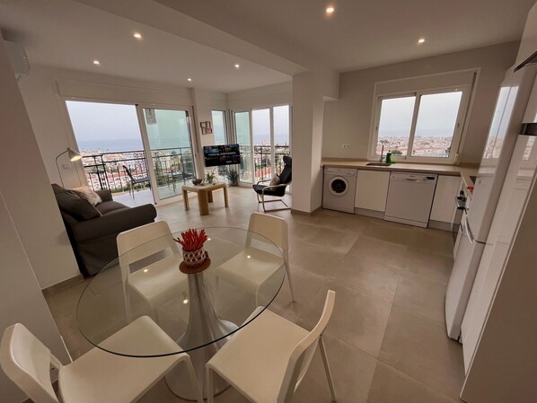 The apartment has stunning Views: Enjoy panoramic views of Nerja, the Mediterranean Sea, and the Sierra Almijara mountains from every room and the wrap-around balcony.