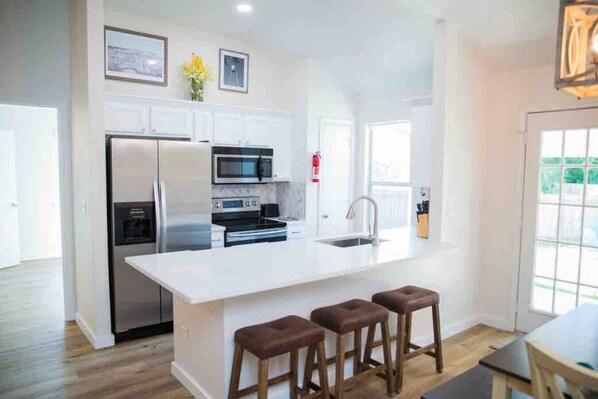 The house also has a full kitchen stocked with everything you need to cook meals during your stay (pots, pans, spices, flour, sugar, and other cooking essentials). There is also a large refrigerator, stove, oven, microwave, and dishwasher. Dishwasher soap and hand washing dish soap are provided.