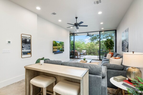 Living Room: Lounge away with your favorite book on the couch or join family & friends on the outdoor patio, featuring stunning views of the Comal River!