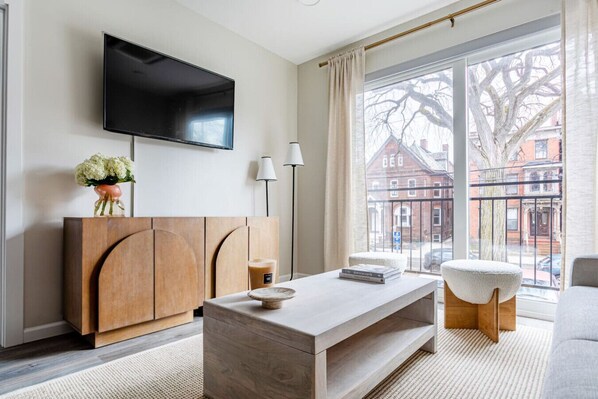 The unit is beautifully done. Our family of 6 had just the right amount of space. Perfect for walking around the city and lots of great food choices close by.