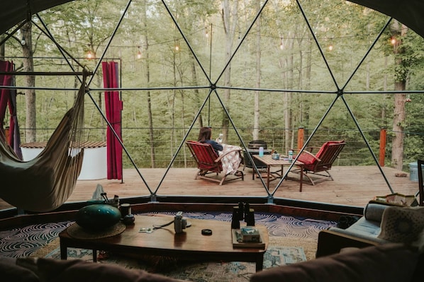 Shared Outdoor Experience Between the domes, a communal fire pit creates a natural gathering place for evenings beneath the stars. Your group will enjoy woodland surroundings, creek access, forest paths, star-filled skies, and the privacy of being the only guest booking on-site.