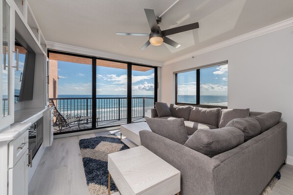 Elegant condominium, completely renovated and updated, overlooking beautiful New Smyrna Beach! Take in the breathtaking oceanfront views, enjoy magnificent sunrises, and watch dolphins play in the surf while relaxing with your morning coffee! Enjoy the newly refinished garage roof that has tennis, pickle ball and a basket ball hoop.