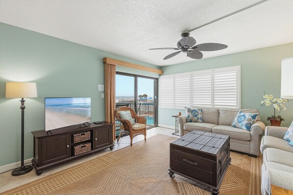 Welcome to Ocean Reef Villas 207! This cute oceanfront 2 bedroom, 2 bathroom condo sleeps 6 guests comfortably. The primary bedroom has a king and the guest bedroom holds 2 twin beds with a sleeper sofa in the living room.