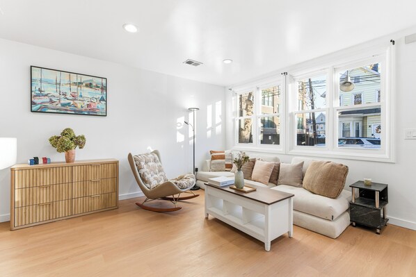 Sun-filled living room with large windows, a comfy sectional sofa, designer rocking chair, and a smart TV — ideal for relaxing after a busy day. Fully equipped kitchen with brand-new stainless steel appliances, gas stove, cookware, dishes, and everything you need to prepare meals. Two peaceful bedrooms with cozy beds, fresh linens, and minimalist décor for restful nights. Private outdoor garden patio with umbrella seating - enjoy morning coffee or a quiet evening drink surrounded by greenery.