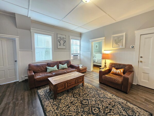 Guests will appreciate the convenience of 1.5 bathrooms, making mornings and evenings a breeze for everyone. Plus, 2 tandem onsite parking spaces add extra ease—an uncommon perk in downtown Newport!