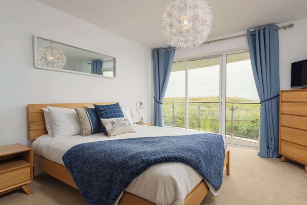 The master bedroom is bright with huge windows also including a sliding door onto the balcony, and white walls. The space includes a king-size bed, chest of drawers, and a wooden desk and chair for vanity use. There is also access to an ensuite shower room.