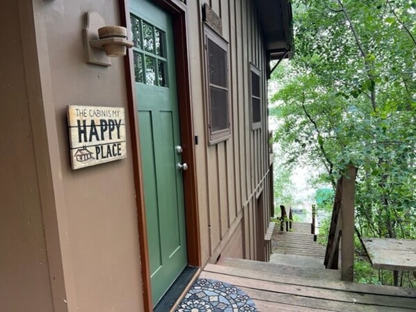 The cabin sits on a hillside, giving you a great view of the woods on one side and the lake on the other. You'll have access to the water via stairs down the hillside with shallow water for wading by shore and great floating on the far side of the dock.