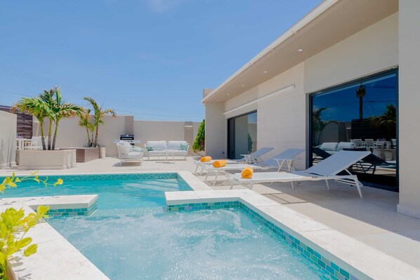 PRIVATE VILLA - Elegant Escape Four-bedroom villa with private pool, jacuzzi (unheated), BBQ grill and conveniently located close to the Palm Beach area; Sleeps standard 8 (up to 10 for an extra fee).