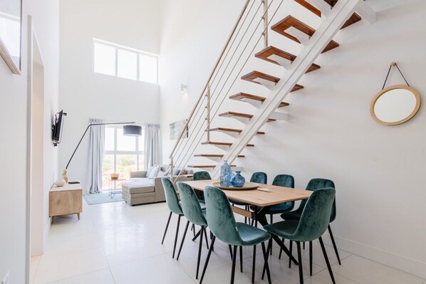 Experience elevated living in this stunning two-story condo in Aruba, thoughtfully designed with comfort and elegance. The open-concept living and dining area flows seamlessly, perfect for gatherings or unwinding after a day in paradise. Luxurious stairs lead to the second floor, adding an elegant touch to the space. The fully equipped kitchen boasts modern appliances, a breakfast bar for casual dining, and a dining table fit for any occasion.