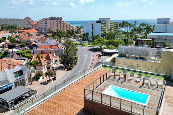 The Condo is just a short walk from restaurants, beach bars, beaches, and the Jolly Pirate Ship excursion. The condo was clean and well equipped. Had 2 small coolers, 6 beach chairs, and float type beach chairs. Only thing it could have used was kitchen wash cloth and towels. We had 3 couples staying in the condo and we never felt cramped. We had 2 cars so it was a little hard with only one parking lot card to get in and out but we were able to get a fab for access to the building for each couple. Definitely worth the stay. Pool is really small but we never used it. Views from the roof are spectacular.