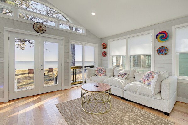**Stunning Views:** Enjoy breathtaking sunrises and sunsets over the Chesapeake Bay from living room and dining room with full floor to ceiling windows/doors and a large picture window, complete with comfortable seating for morning coffee or evening cocktails.