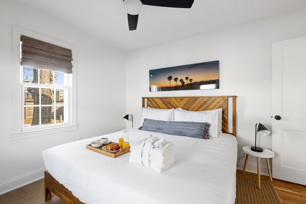 Inside, the cozy two-bedroom, one-bath home comfortably sleeps four and features a stylish boho vibe throughout. The open living room offers a large Smart TV, while the fully equipped kitchen with counter seating makes meals easy. Enjoy your coffee or dinner on one of two porches, including a screened-in option.