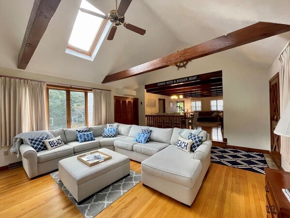 Escape to Chatham for an unforgettable experience at this spacious 5-bedroom, 2-bath home, just perfect for an extended family vacation as it comfortably sleeps 11 guests with two queen beds, a bunk bed, four twin beds, and a trundle. One large family room boasts plenty of seating for a game or movie night, while another living room offers more space to spread out and relax in. The expansive backyard is ideal for outdoor fun, offering plenty of space for lawn games and for your dog to play. After a day in the surf and sand, rinse off in the outdoor shower before relaxing on the patio with a cold drink. Enjoy easy access to Chatham's vibrant town center for shopping, dining, and entertainment. Visit the local playground or catch a baseball game at Veteran's Field! Stay comfortable with air conditioning in every room and connected with complimentary Wi-Fi. This prime location offers a short drive to Pleasant Bay, Oyster Pond Beach, or Nantucket Sound, and a brief walk to Ryder's Cove Marina. A nearby bike path is also easily accessible, so don't forget your bikes! We welcome up to 2 dogs to join your family vacation! As a special welcome, the owner provides a reusable tote filled with paper and cleaning products. Contact Chatham Rentals today to start planning your perfect getaway!