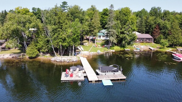 Welcome to beautiful Chandos Lake. This cottage is perfect for extended family/friends. 2 separate areas, each with their own fully equipped kitchens (including a Keurig coffee machine), full bathrooms and a total of 5 bedrooms. Easy access, lots of parking and a level lot. There is a large dock and there are multiple decks to hang out on. Jump right in off the dock (7 feet deep) or walk right in from the small sandy beach. There is a fire pit with lots of firewood, a horseshoe pit, 2 kayaks, a small pedal boat, lots of pool noodles, 2 bbq's, 3 patio tables and lots of chairs. A small tin boat with a small motor is also available for those who have their boating license. For rainy days or evenings there are lots of games and a large TV/DVD player and a variety of DVD's. All bedrooms without bunk beds have a ceiling fan. Rooms with bunk beds have standup fans. The cottage is not pet friendly (due to allergies) and while there is good cell service, there is no wifi. The local marina's serve Kawartha Dairy Ice Cream and have worms for fishing, there are a few local restaurants/pubs within a 15 minute drive and the Gut Conservation Area is located close by.