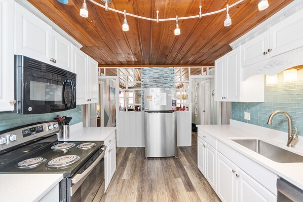 This lower level of a duplex has four bedrooms/two bathrooms. The kitchen is stocked and has quartz countertops. This eclectic unit has a great coastal vibe and can comfortably sleep 10 people. It's perfect for large families, golf trips or sports group. There is a washer/dryer in the unit and plenty of parking (up to four vehicles). Each bedroom has its own TV along with a large TV in the living area. There is an Alexa Dot available in the living area to play music or answer questions. Guests can unplug this during their stay but we ask that you plug it back in prior to leaving.