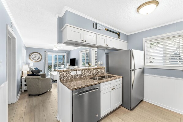 This beautiful and comfortable first floor condo is perfect for your family vacation and is only a few steps to the sandy beach. A beach dolly with large inflatable tires and 4 beach chairs are provided to make your trip across to the beach a breeze. Strap on your cooler and chairs and enjoy a full day on the beach or spend some time at the beautiful, large, well maintained pool also just steps away from your front door.