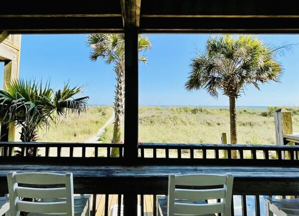 Wake up from a fantastic night's sleep in your private KING master suite and meet the sunrise over the gorgeous Atlantic ocean just steps away from this lovely renovated DIRECT OCEANFRONT home away from home. This inviting, spacious, and comfortable beach house will make you want to stay forever. Cook up a yummy breakfast in one of the 3 well-equipped kitchens. The ample counter space will allow you to spread out and make something great! The kids will love eating at the OCEANFRONT breakfast bar while you head to the 1st floor deck to enjoy peaceful cup of morning coffee.