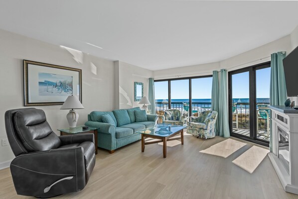 The open, light‑filled living area includes floor‑to‑ceiling windows and a cozy electric fireplace, creating a warm and inviting space to unwind after a day on the beach. The fully equipped kitchen offers stainless steel appliances, dinnerware, cookware, and the rare treat of ocean views while you cook. An in‑unit washer and dryer adds convenience for longer stays.