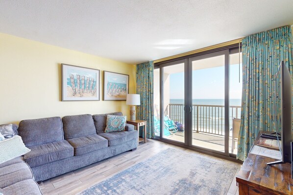 This beautiful oceanfront condo features bright colors, sleek wooden flooring, nautical decor, and a spacious open floor plan. Open the curtains to reveal the ocean view from your private balcony. Kick back and watch a movie on the 60” TV with DVD player. Black granite countertops, white cabinetry, and a dazzling backsplash give the open kitchen a distinct personality. A full suite of stainless steel appliances includes a refrigerator with icemaker and water dispenser, a dishwasher, and an electric range. The dining area also includes a formal dining table and a small wet bar, complete with a wine fridge. Three comfortable bedrooms offer a good night's rest, the coveted primary suite featuring a king bed, a 42” TV, balcony access, and an en-suite bathroom with a walk-in shower. Extra perks include complimentary WiFi, cable TV, and a private washer/dryer.