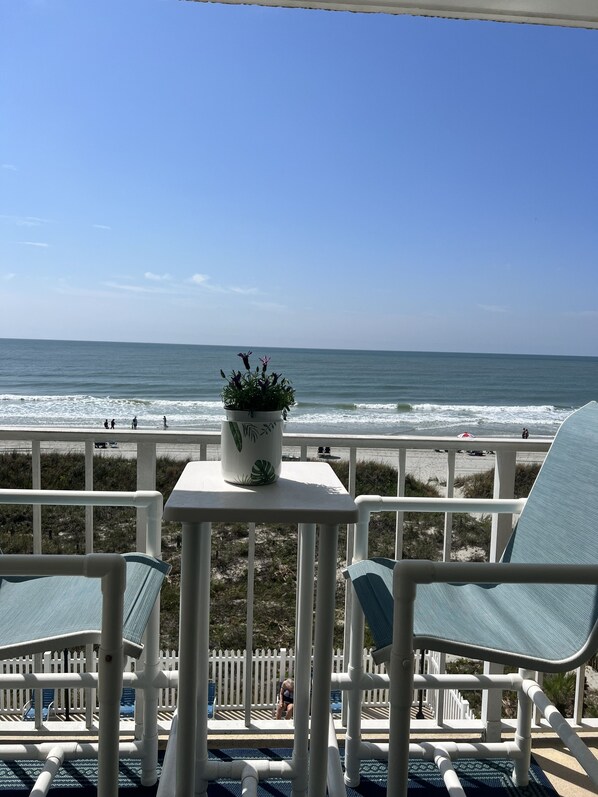 Don't miss this direct oceanfront two bedroom/two full bath condo with amazing ocean views. Newly updated furniture throughout and brand-new stainless-steel appliances allow you and your family to easily spend the day at the beach and then step inside to make a great dinner, enjoying your meal on the oversized balcony table area as the sun sets in the distance. Or if you prefer to go out, the condo is minutes from Barefoot Landing and several other restaurants are even within walking distance in the popular Windy Hill section of North Myrtle Beach. The condo features expansive floor to ceiling glass sliders allowing limitless views from the entire living space and a large queen bed master suite with a brand new 65 inch smart tv. The second bedroom has two twin beds, a tv and an attached bathroom for privacy. The kitchen is fully equipped with everything you might need including a stove, microwave, dishwasher, and full-size freezer/refrigerator as well as a washer and dryer in the hallway. There is also a queen size sleeper sofa in the living room with an additional tv.