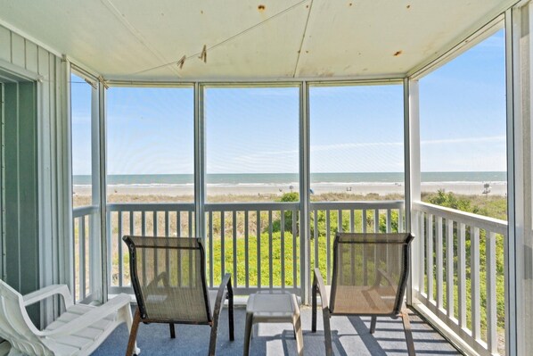 Located on the first floor this two-bedroom, two-bathroom condo has amazing ocean views from its private balcony, a washer and dryer and plenty of amazing updates. The neutral living room has laminate flooring, a flatscreen tv and sleeper sofa and opens to the balcony. The kitchen offers upscale cabinets, granite countertops and the same beautiful flooring. Wander down the hallway to the master bedroom with its own balcony access and private bathroom. The second bedroom is perfect for your little ones and has two twin beds with bright colored bedding and a television. Palmwood Villas is an oceanfront resort in North Myrtle Beach that is private, peaceful, and bound to be one of your go-to destinations for years to come. From the sun deck to the oceanfront pool, you'll enjoy the luxuries just steps outside of your door. When you're not at the beach or the pool, you'll find that Palmwood Villas is centrally located in the Crescent Beach section of North Myrtle Beach, putting the action of Main street to the north and the fun and excitement of Barefoot Landing to the south.
