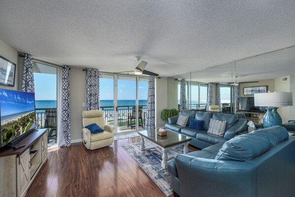 This immaculately furnished and decorated condo has magnificent oceanfront views of the beach. You are virtually sitting on the beach in the third floor balcony with access from the living room and the master bedroom. The condo is spacious throughout (1600 square ft), and has ceramic tile floors in the foyer, kitchen, bathrooms and utility rooms. Hardwood flooring in all the bedrooms, dining area, and living area. All living areas, bedrooms, and bathrooms are beautifully decorated, with flat-screen TVs in each room. The kitchen was just upgraded with new cabinets and granite counter-tops.