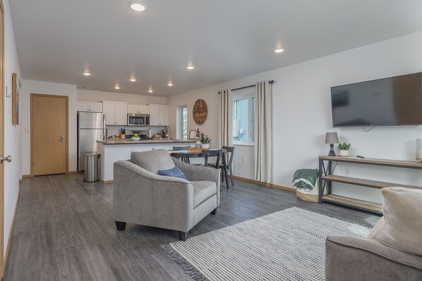 Have fun with the whole family at this stylish place. Brand new building, with all the amenities necessary to enjoy your stay in North Pole. Enough room to sleep 6 people with 1.5 bathrooms. Centrally located In the City of North Pole with easy commutes to Fairbanks, Eielson AFB and Fort Wainwright. This is a new and spacious two bedroom house with all the amenities of a town home. On the main level is the open kitchen, living, and dining area, along with a half bath. The kitchen is fully equipped for an extended stay. The sofa is a queen size sleeper. Upstairs is two bedrooms and a full bathroom. You'll enjoy hotel quality bedding, towels, and mattresses. There is one queen size bed in first bedroom and a bunk bed (which is a full size on the bottom and a twin size on the top) in the second bedroom. The laundry area is also stocked with essentials. This home is five minutes from the local tap house, a few local favorite restaurants, The Santa Clause House, and a short drive from outdoor recreation areas. As always, please ask us if you have any questions! We're happy to help! Unit B, entry details will be provided on arrival. Newer neighborhood, near parks, groceries, and restaurants. Located in the City of North Pole, with public water sewer and road services. You'll likely rent a car when visiting Fairbanks and North Pole, Alaska, but there is a city bus route and details are in your Welcome Book. There is parking for your car in front of the unit. Kitchen is fully stocked with essentials for extended stay, and the laundry room has supplies for completing your laundry.