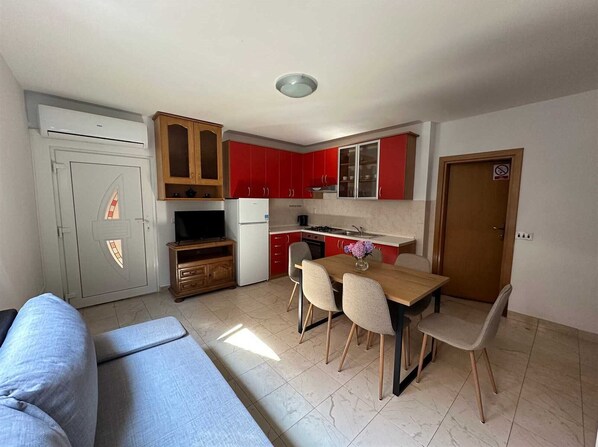 Standard apartment situated in second house of Bella Sky apartments complex. Apartment has twobedrooms with queensize beds, each room for two people, fully equipped kitchen, living room with sofa for two people and TV, bathroom with shower and terrace with garden view and sitting area.Apartment can accomodate up to 6 guests and is located on ground floor. Apartments Bella Sky are near the city center, right on the shore, closeto the beach, city centre, shops, market and restaurants.