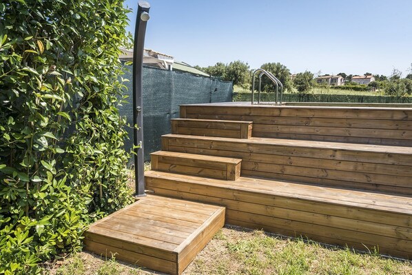 Descrizione: Ampia villa a schiera quadrilocale con giardino su tre lati. Ampio salone con tavolo da pranzo e divano-letto doppio – cucina separata – camera padronale con letto matrimoniale – seconda camera con due letti singoli – terza camera con letto singolo – bagno con box doccia – bagno di servizio – delizioso giardino privato completamente recintato attrezzato con tavolo, sedie, pergola e sdraio – disimpegno con lavatrice e lavastoviglie - meravigliosa piscina privata in giardino - DOPPIO posto auto coperto e riservato. Aria condizionata nella camera matrimoniale e nella camera con due letti singoli. Animali ammessi.
