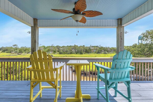 My family enjoyed the peaceful view and location. It is just about a 5-10 minute walk to the beach and is a direct shot to the public access point. The house is spacious and the large outdoor deck makes it easy to cook and eat outdoors overlooking the marsh. Kitchen was stocked well, but remember your spices. We forgot them of course, but made due. Overall a great stay!