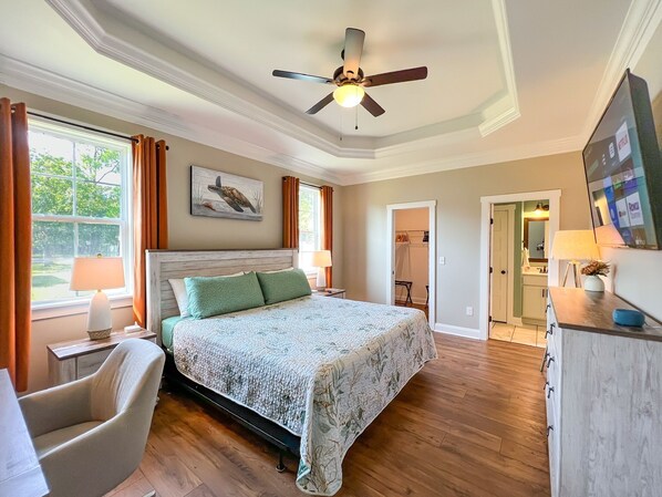 When its time for bed, pick your favorite spot to retire. The primary bedroom has a huge en-suite bathroom, a king bed with extra large pillows and extra soft sheets, a 65” Smart TV, and desk with office chair, and plenty of storage in the dresser and walk-in closet. The 2nd large bedroom also boasts a king bed, large closet and smart tv making this home perfect for 2 families. The 3rd bedroom with 2 queen beds, a desk and chair, 39” Smart TV and plenty of storage for suitcases. The main bathroom is equipped with a hair dryer and updated with a new shower and granite vanity.