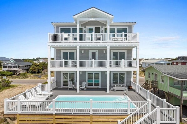 OCEANFRONT!  7BR/5BA/1HBA - BR1:1K, BR2:1K, BR3:1Q, BR4:1Q, BR5:1Q, BR6:1Q, BR7:1Q.  This fantastic home is Shore 2 Pleez, newly constructed in 2023 resting atop an oceanfront bluff on the exclusive west end of Oak Island. Rising three stories up on a well-designed inverted floor plan to ensure the absolute most awe inspiring and dramatic panoramic views of the coast and Atlantic Ocean imaginable! 7 magnificent bedrooms, 5.5 opulent bathrooms, a 11’ x 24’ drop-in private swimming pool, and an elevator to service it all from the ground level all the way to the top floor! A gourmet kitchen with island to satisfy even the peskiest Chefs in the family and walk-in pantry to stock up for your stay. Shore 2 Pleez’s upscale appointments are endless including a King or Queen size bed in every bedroom, LVP/LVT flooring, quartz tops, ample lighting, luxurious fixtures and more. Gather on the top floor Great room, or outside deck to create memories with your family and friends that will last a lifetime! Hang out at the pool or head to the beach for some fun in the sun knowing all awhile that a mini-kitchen and bar area await you for a cold, refreshing drink when it is time to cool off. Ride bikes to the Point, load a paddle board or kayak in the backwater Sound, throw horseshoes on the beach, surf fish, crab, fly kites, or take advantage of the countless outdoor activities that Oak Island and the surrounding area has to offer. What else could you possibly be looking for? Shore 2 Pleez beckons you to the North Carolina coast now for the most enriching vacation experience of your lifetime! Linens & Departure Maid service included Saturday to Saturday only in Prime & Resort seasons, minimum 3-night stay in all other seasons. No Pets of any kind. Check-In 3-5PM Check-Out: 10:00AM