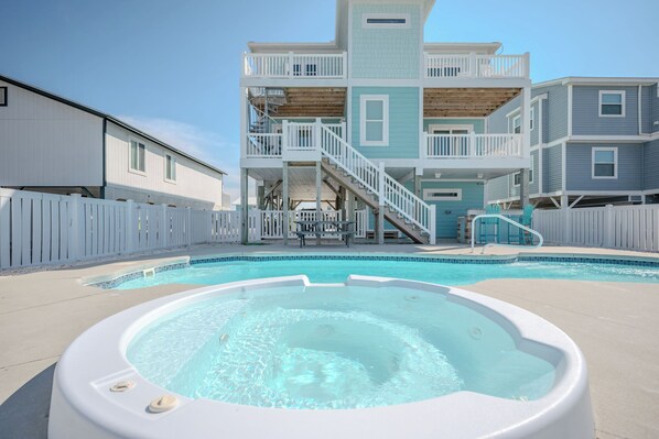 Le funzionalità di fascia alta si estendono anche all'esterno, dove troverai una vasca idromassaggio invitante a cascata in una piscina privata, che può essere riscaldata per ulteriori $ 50 al giorno. Circondato da comodi mobili e una cucina esterna integrata con grill a gas, trascorrerai ore godendoti la brezza dell'oceano mentre ti rilassi con una bibita fresca.