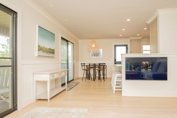 The bright living room welcomes you with a large sectional flanking the coffee table and mounted flat screen smart TV so you can enjoy time as a family following a day exploring the island. Need to work from home? The dedicated office space features a desk and chair so you can experience the ultimate work-life balance at the coast!