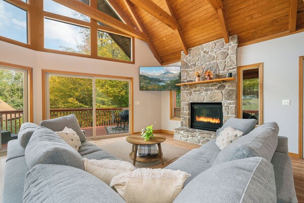 Outdoor Living • Sip cocoa or wine on the wrap-around deck with panoramic views • Hot tub magic under the stars • Gather around the fire pit for stories and stargazing • Explore nearby trails, waterfalls, and endless lake fun