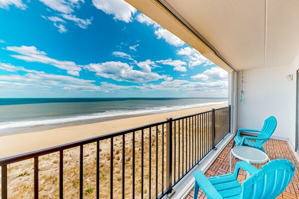 Beachfront condo with ocean views, private balcony, central AC, & W/D